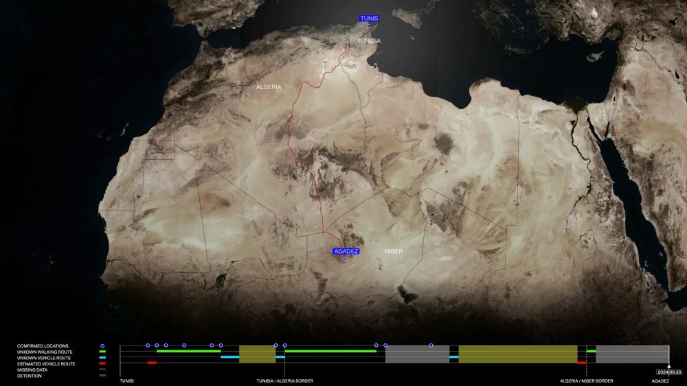 The Deportation Chain is an investigation into the increasing practices of forced expulsions from Tunisia and Algeria to Niger. It draws on GPS data, WhatsApp messages and video testimonies shared by Abdallah (whose name has been changed to protect his identity), with migrant's rights NGO Refugees in Libya (RIL) & The Association for Juridical Studies on Immigration (ASGI), who provided support to Abdallah during his journey. Abdallah, a Sudanese national who fled war in search of safety, was initially arrested on May 3rd, 2024, at an informal camp outside the UNHCR office in Tunis.